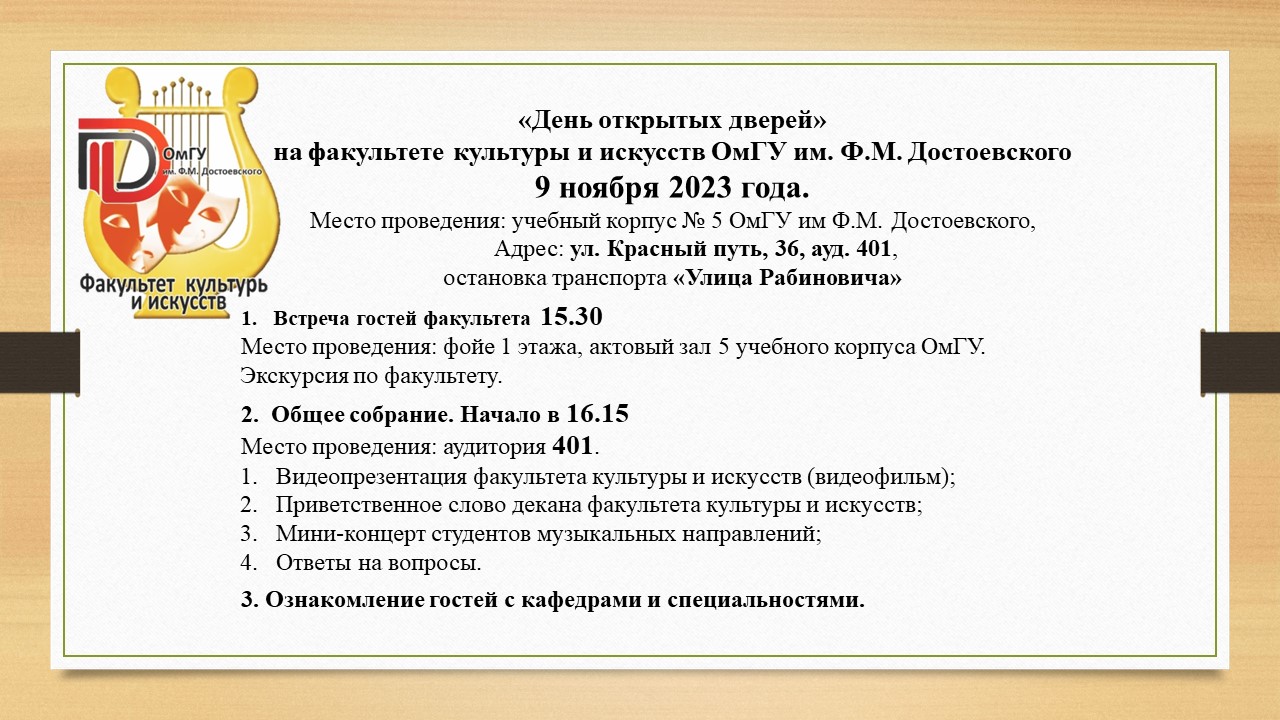 Факультет культуры и искусств открывает свои двери для всех желающих! В программе: мини-экскурсия, демонстрация видеофильма о факультете культуры и искусств, приветственное слово декана, мини-концерт студентов музыкальных направлений, презентация образовательных программ, мастер-классы и презентации по направлениям подготовки и специальностям, знакомство с заведующими кафедр и ведущими преподавателями, а также ответы на вопросы абитуриентов и их родителей.