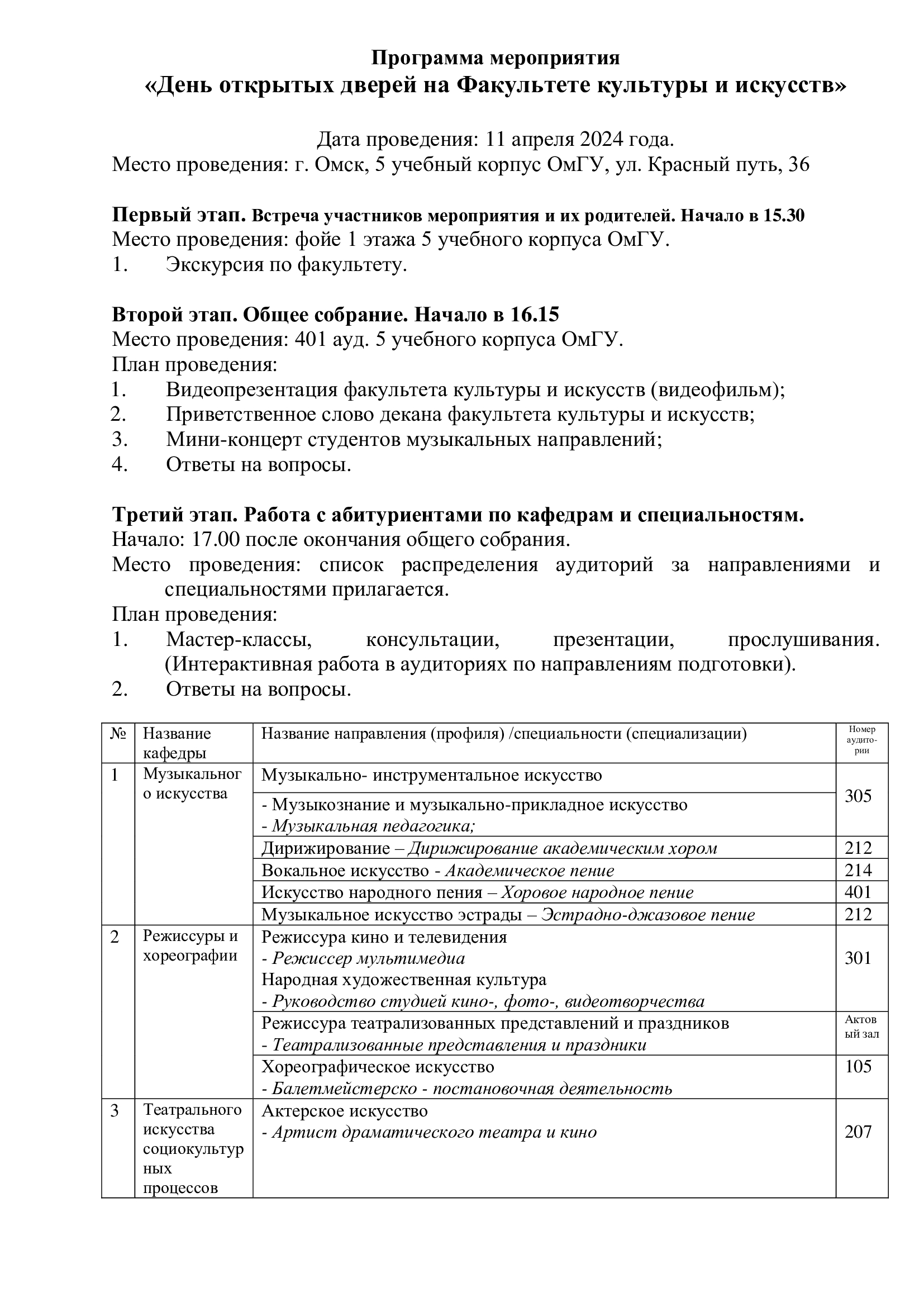 Факультет культуры и искусств открывает свои двери для всех желающих! В программе: мини-экскурсия, демонстрация видеофильма о факультете культуры и искусств, приветственное слово декана, мини-концерт студентов музыкальных направлений, презентация образовательных программ, мастер-классы и презентации по направлениям подготовки и специальностям, знакомство с заведующими кафедр и ведущими преподавателями, а также ответы на вопросы абитуриентов и их родителей.